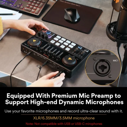 - MİKROFONLARLA UYUMLULUK: XLR kondenser/dinamik mikrofonlar, 6.35MM dinamik mikrofonlar ve 3.5MM mikrofonlar dahil olmak üzere çoğu analog mikrofonla uyumludur.