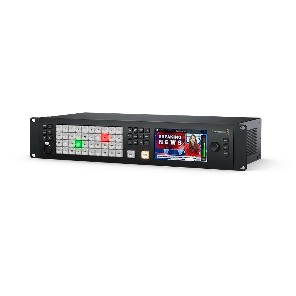 Her girişte referans video girişi, kare senkronizatörü, kare hızı dönüştürücü ve format dönüştürücü bulunur. Bu sayede, genlock özelliği olmayan kameraları, farklı formatları ve bilgisayar kaynaklı video girişlerini kolayca birleştirebilirsiniz. Upstream ve downstream keyer’lar ile efektler canlı olarak ve gerçek zamanlı çalışır, render gerekmez. Switcher, entegre ön panel, opsiyonel Blackmagic ATEM panelleri veya indirilebilir kontrol yazılımı ile kontrol edilebilir.