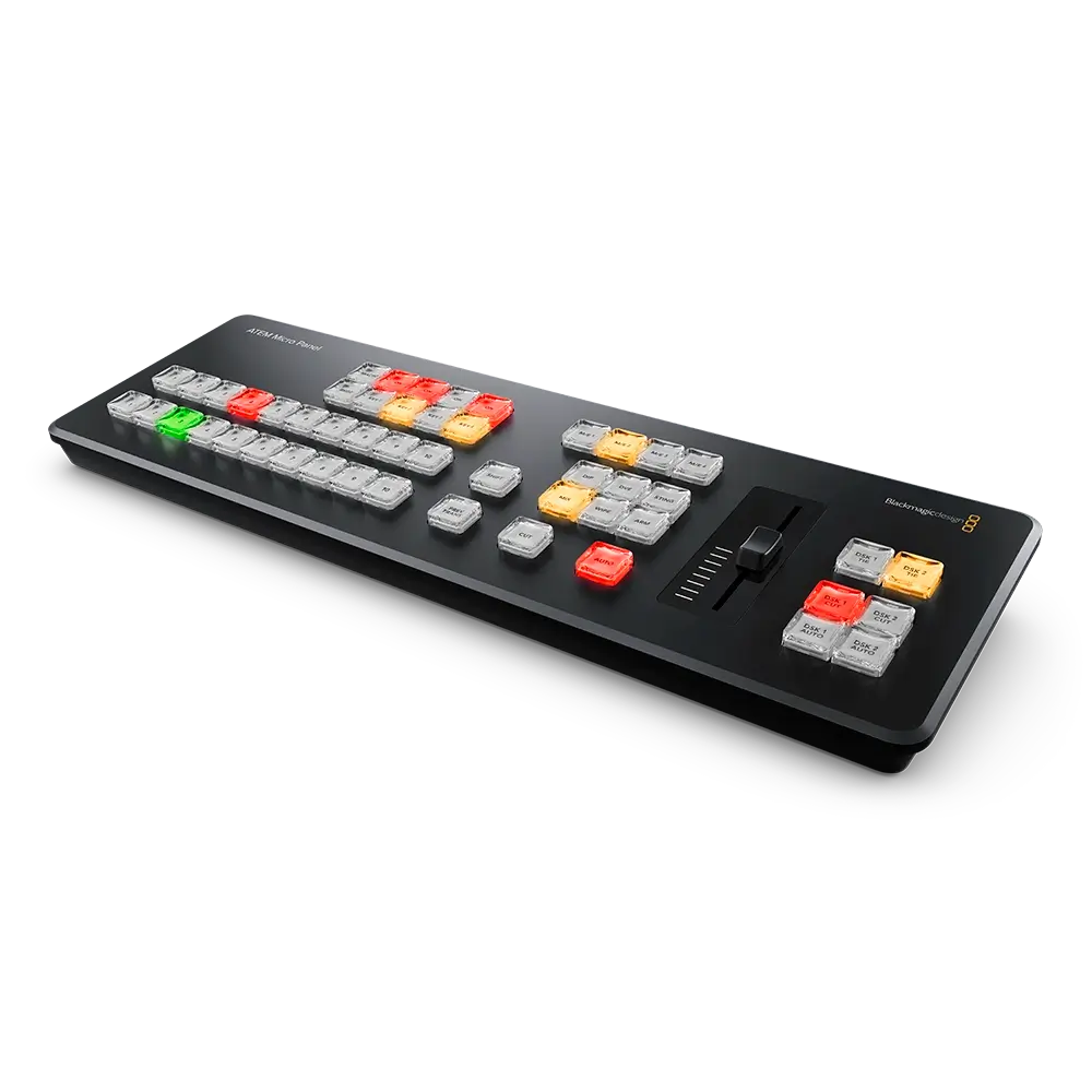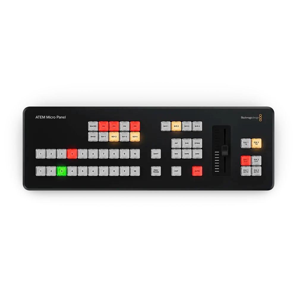 ATEM Micro Panel, ATEM Software Control kullanırken fiziksel switch kontrolü için mükemmel bir donanım panelidir. Profesyonel tasarımı, arkadan aydınlatmalı düğmeleri ve kompakt boyutu ile hareket halindeki kullanıcılar için ideal bir seçimdir. Program ve önizleme için iki sıra düğme, keyer’lar, geçişler ve makrolar için özel düğmeler sayesinde en büyük switcher’ları bile yönetebilir. USB-C ve Bluetooth bağlantı seçenekleri ile uzun ömürlü dahili bataryası, onu gerçekten taşınabilir bir panel yapar. Stüdyoda veya dış mekânda, ATEM Micro Panel, ATEM Software Control için kompakt bir panel arayanlar için mükemmel bir çözümdür.