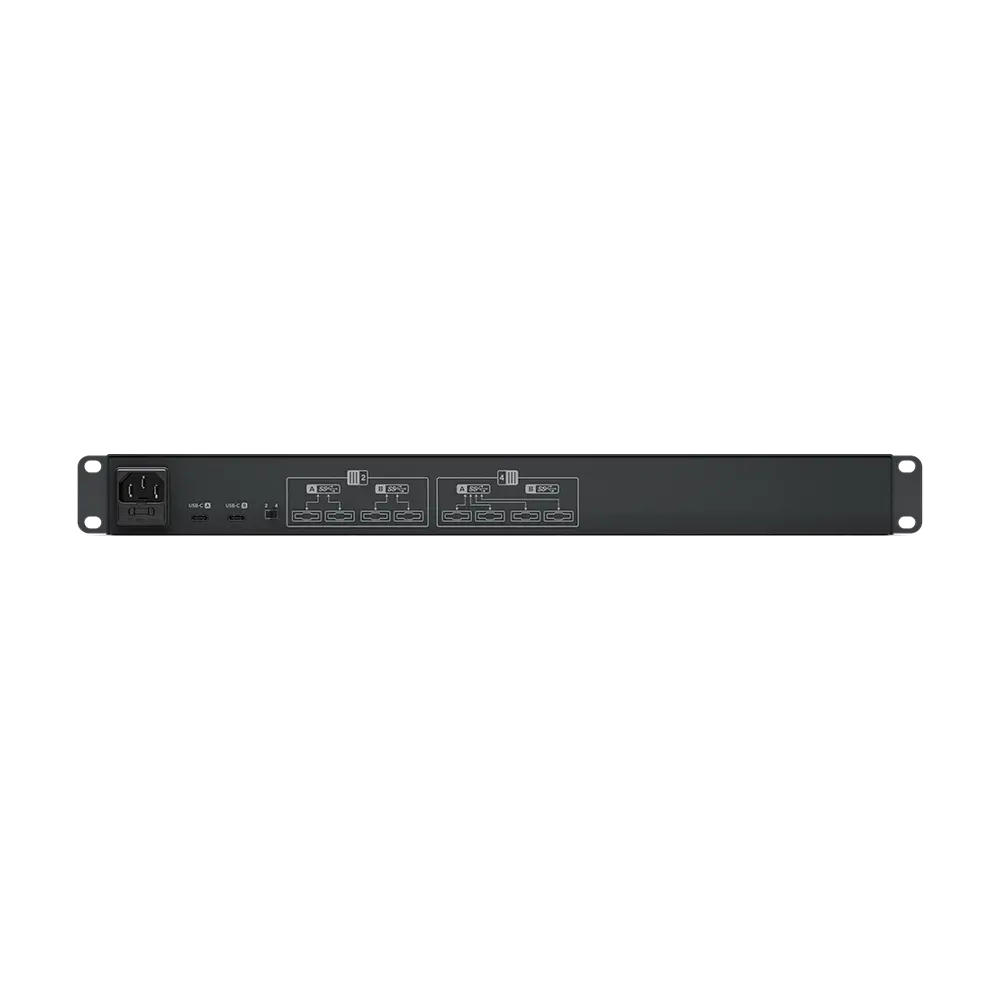 Arka panelde iki adet USB-C bağlantısı bulunur. Üzerindeki seçim anahtarı sayesinde tüm dört disk tek bir USB-C port üzerinden kullanılabilir veya her port iki diske ayrılarak paylaşımlı kullanım sağlanabilir. Dahili AC güç kaynağı, aynı anda dört SSD ya da HDD çalıştıracak gücü sağlar.