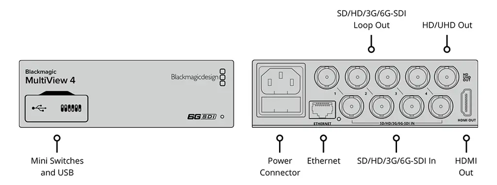 Blackmagic MultiView 4, dört bağımsız 6G‑SDI girişi ile SD, HD ve Ultra HD formatlarını (2160p30’a kadar) destekler. Dahili Ethernet uzaktan kontrol yazılımı sayesinde ses ölçerlerini açabilir, çıkış için ses seçebilir ve özel etiketler oluşturabilirsiniz. MultiView 4, kaynaklarınızı standart 2×2 ızgara formatında görüntüler. Ayrıca opsiyonel Teranex Mini Smart Panel ekleyerek tam ön panel kontrolü sağlayabilir ve Teranex Mini Rack Shelf ile rack montajı yapabilirsiniz.