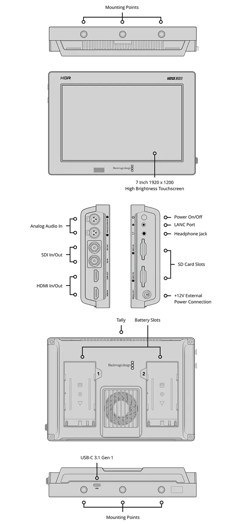 Ekran Ölçüleri:7 inç 1920 x 1200. Ekran Parlaklığı:2500nit Ekran Rengi:P3 geniş renk gamı Uzaktan Kontrol:Kaydı Başlatmak ve Durdurmak için 1 x 2.5mm LANC. SD Arayüz:Çift UHS‑II SD yuva. Depo Türü |
