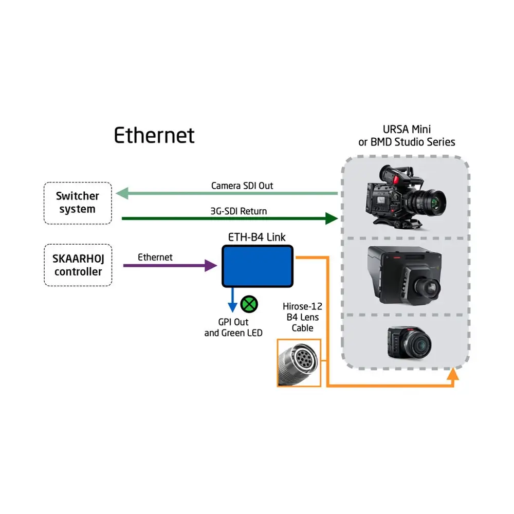 SKAARHOJ ETH-B4 Link, belirli Blackmagic kameralarla Blackmagic UDP Camera Control protokolü üzerinden uyumludur ve ağ üzerinden veri girişini destekler. Ünite, iris kontrol verilerini kamera kontrol verilerinden ayrı olarak Ethernet üzerinden gönderir, böylece hassas ve kesintisiz kontrol sağlar.