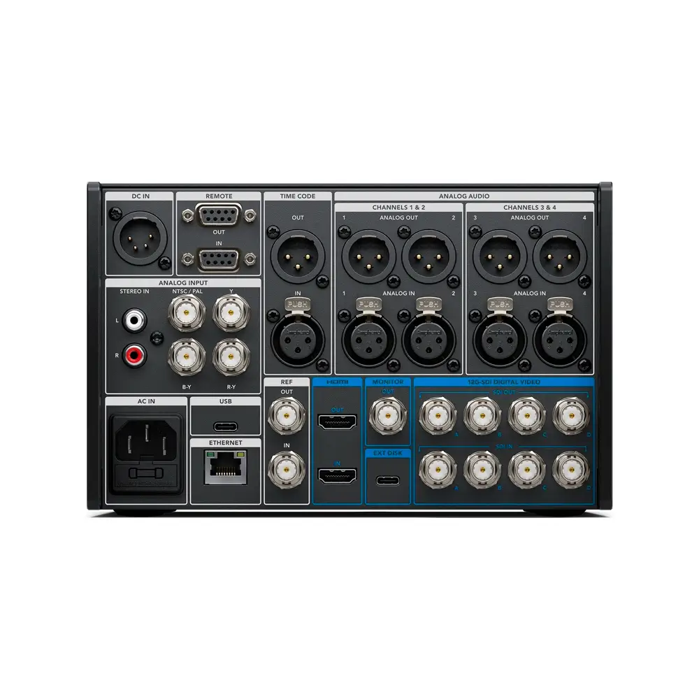 Çok çeşitli video ve ses bağlantıları sunar: Quad Link 12G-SDI SD, HD, UHD ve 8K cihazları ile uyumludur. 12G-SDI çıkışları RGBA 4:4:4:4 dosyaları için fill ve key desteği verir. Multi-rate HDMI portu, tüketici televizyonları ve projeksiyon cihazları için uygundur. Arşivleme için dengeli analog ve hi-fi ses ile timecode bağlantıları mevcuttur. Monitor SDI çıkışı, overlay içerir. USB Type-C portu ile flash disk veya disk array bağlanabilir. 10G Ethernet yüksek hızlı yükleme için idealdir.