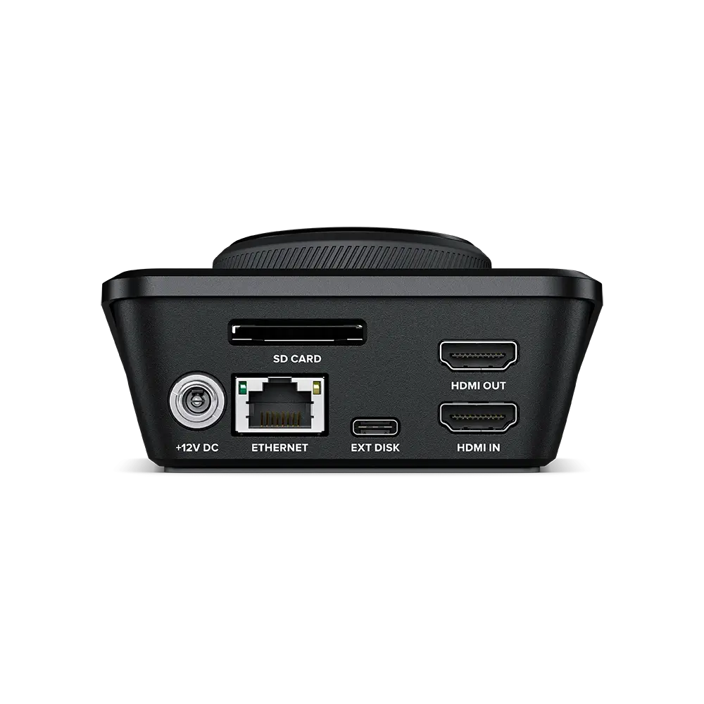 HDMI girişi, ATEM Mini gibi kameralar ve switch’lere bağlanabilir; HDMI çıkışı, sunumlar veya ATEM Mini switch’ler için uzun format medya oynatıcı olarak kullanılabilir. Arka panelde 12 VDC güç girişi bulunur; adaptör dahildir. 1 Gigabit Ethernet, uzaktan kontrol ve dosya yüklemeleri sağlar.