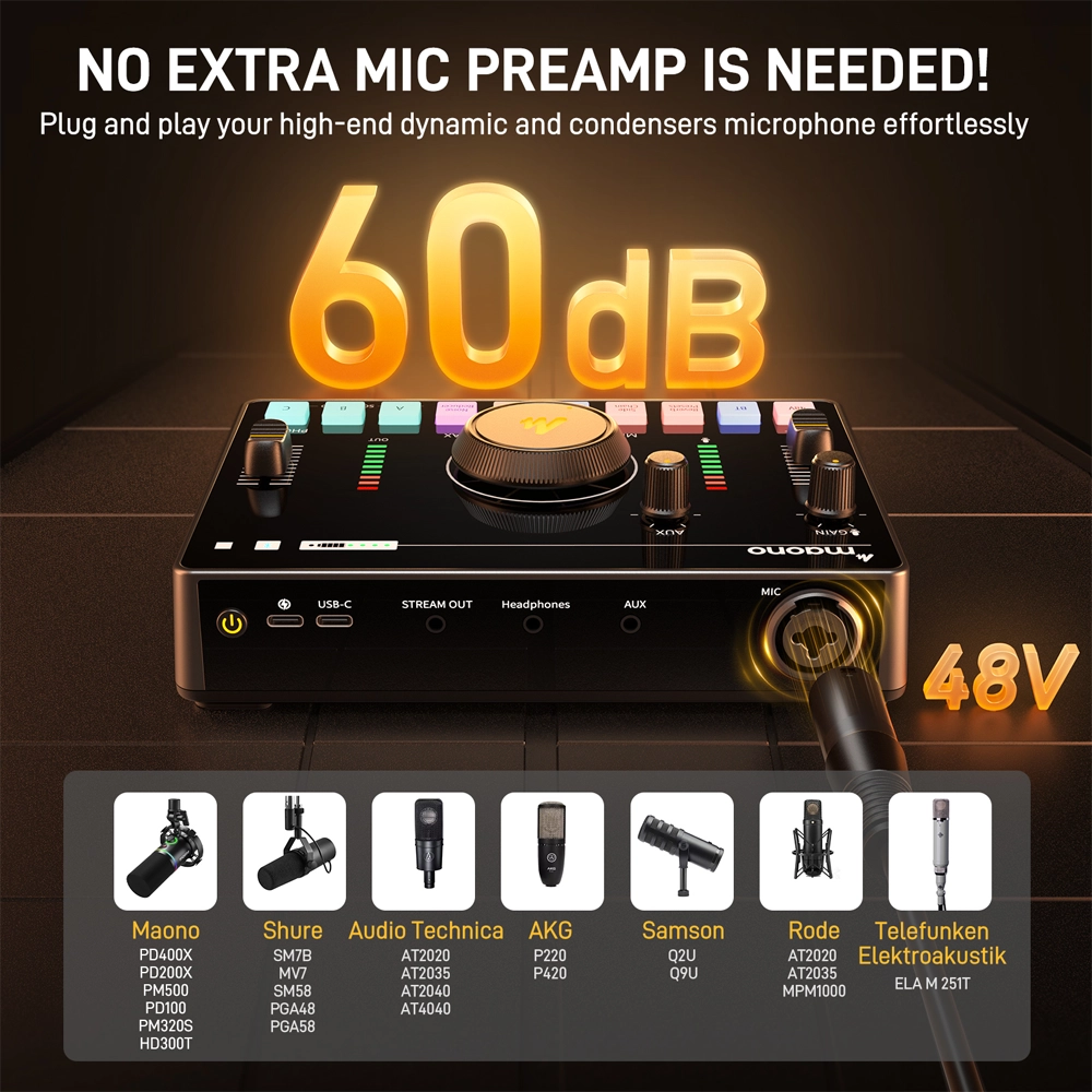 60dB’e kadar ayarlanabilir preamp sayesinde dinamik mikrofonlarla uyumludur.