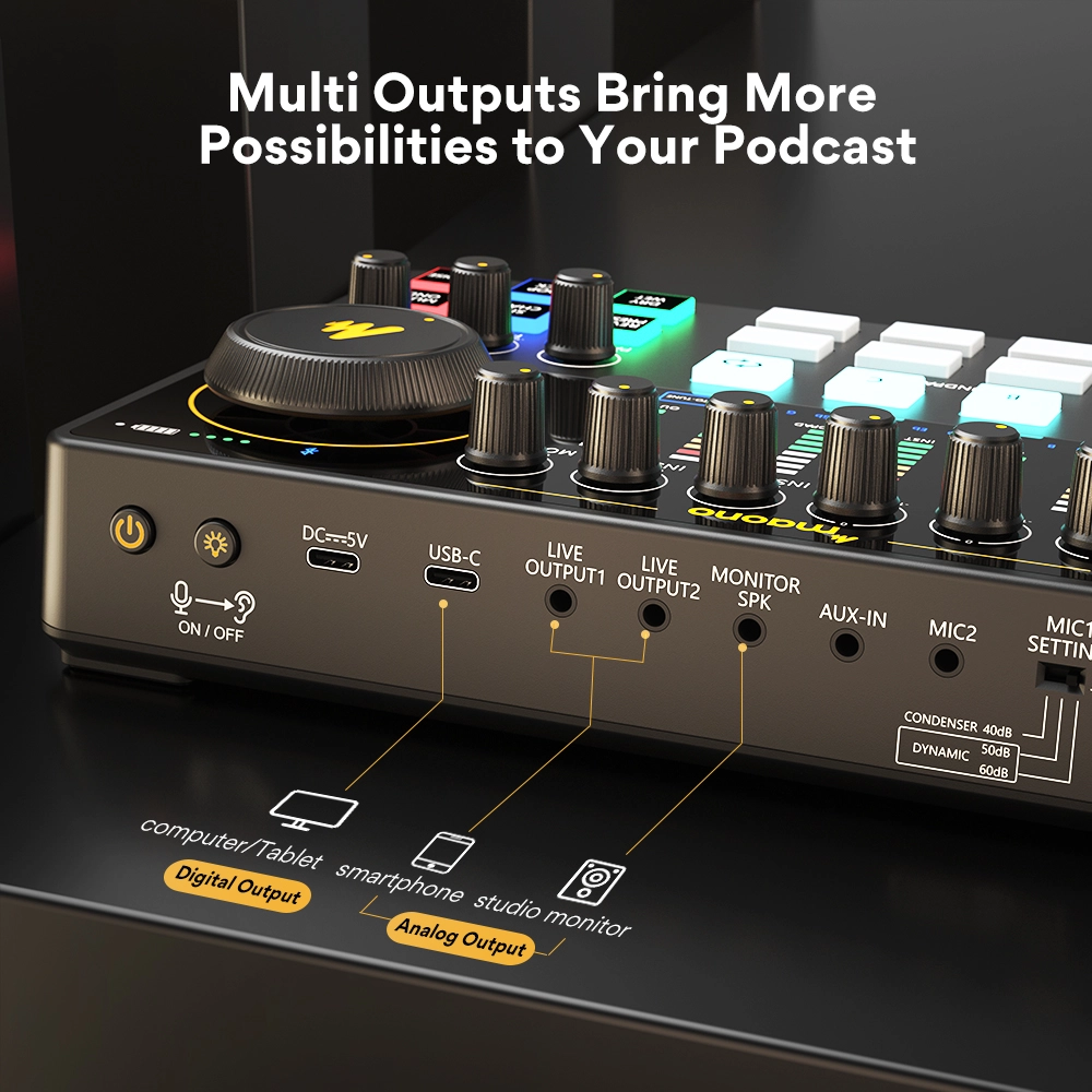 Maonocaster AME2 Tikmic, bilgisayarınıza veya tabletinize USB-C ile bağlanabilir; LIVE-OUTPUT1/2 üzerinden akıllı telefonunuza bağlanarak podcast kaydı ve yayın yapabilirsiniz. MONITOR SPK üzerinden stüdyo monitörüne ses çıkışı bağlanabilir, AUX-IN jakı ile akıllı telefon veya diğer cihazlardan eşlik sesi girişine izin verir. MIC1/2 girişleri ile favori XLR kondenser/dinamik mikrofonunuzu bağlayabilirsiniz.
