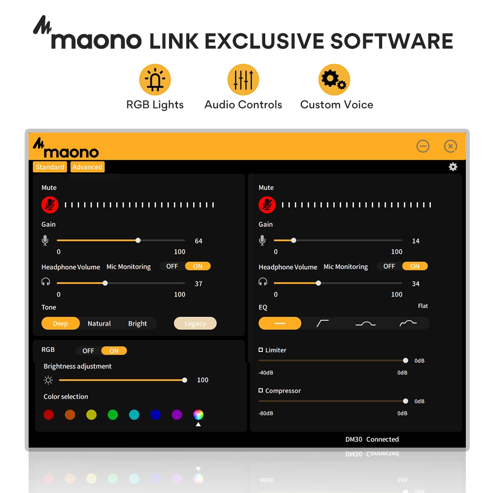 Ⅳ. Maono Link Yazılımı ile Güçlendirilmiş: Maono Link sayesinde RGB aydınlatmayı kişiselleştirin, EQ, limiter, kompresör ve daha fazlasını özelleştirerek sesiniz için daha fazla olasılığı ortaya çıkarın.
