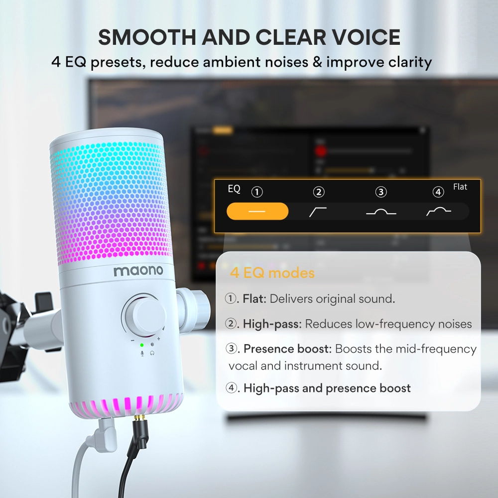IV. Maono Link Yazılımı ile Güçlendirilmiştir: Maono Link yazılımı ile RGB aydınlatmayı kişiselleştirin ve EQ, sınırlayıcı (limiter), kompresör gibi ayarlarınızı özelleştirerek sesiniz için daha fazla imkanın kilidini açın.