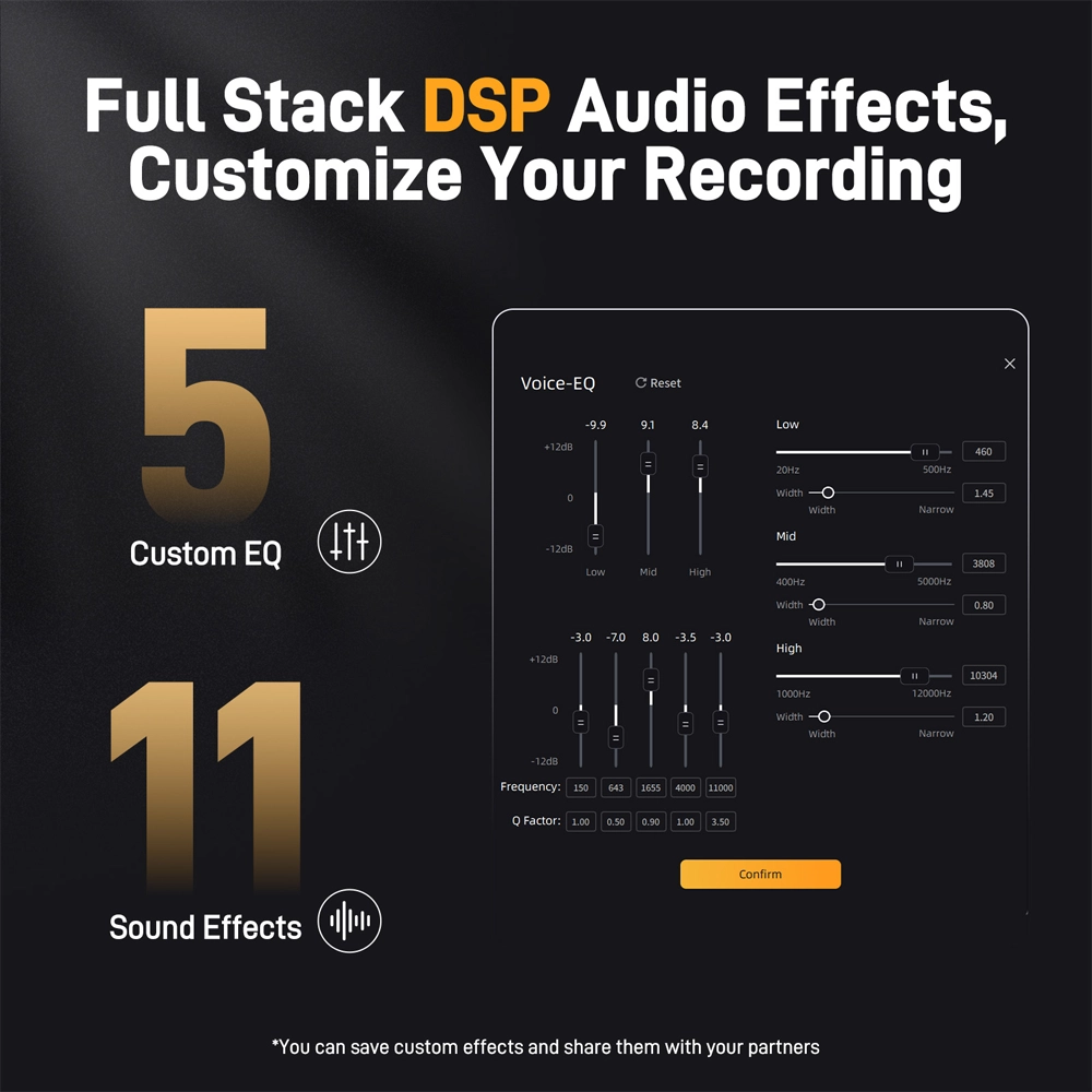- SESİNİZİ KOLAYCA ÖZELLEŞTİRİN: Maono Link yazılımı, ses özelleştirmeyi basitleştirir: gürültü azaltmayı etkinleştirir, 5-bant EQ ayarı yapar, mikrofon ayarlarında ince ayar sağlar ve 11 DSP efekti ile hafıza fonksiyonu sayesinde tercihlerinizi cihazlar arası korur, böylece çevrimiçi sesinizin tam kontrolünü zahmetsizce alırsınız.