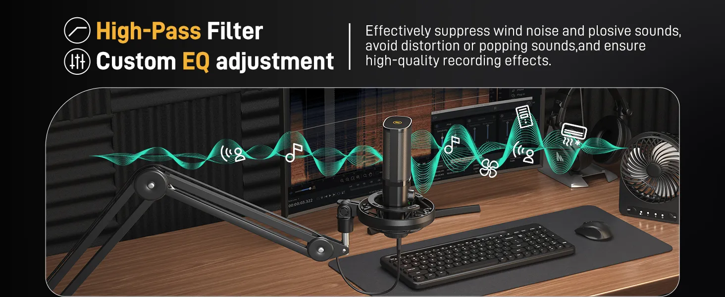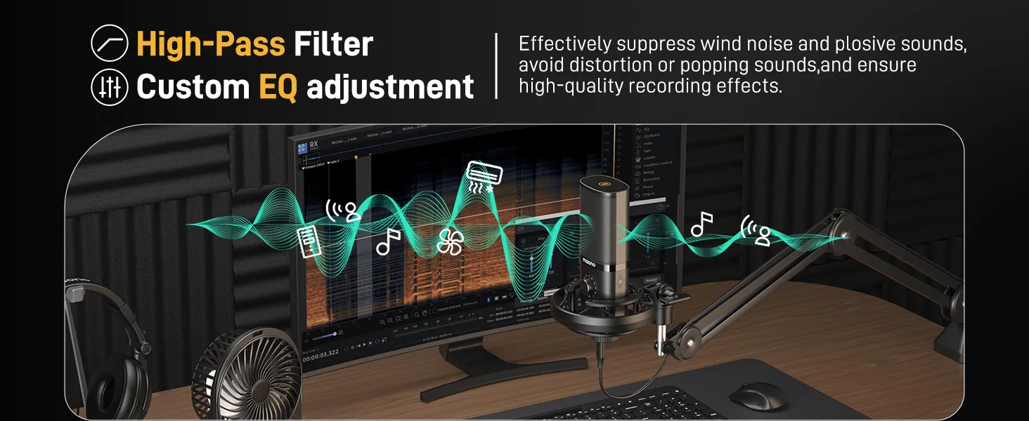 - GELİŞMİŞ GÜRÜLTÜ AZALTMA TEKNOLOJİSİ: Gelişmiş gürültü işleme teknolojisi ile üstün ses kalitesi ve güvenilirlik sağlar; kardioid ses alış modu eksen dışı gürültüyü bastırır, buna ek olarak geçiş yapılabilir (switchable) yüksek geçirgen filtre (high-pass filter) arka plan gürültüsünü azaltır ve entegre pop filtre ile çift bariyerler gürültü azaltmayı artırarak net ve doğal ses üretimi sağlar.