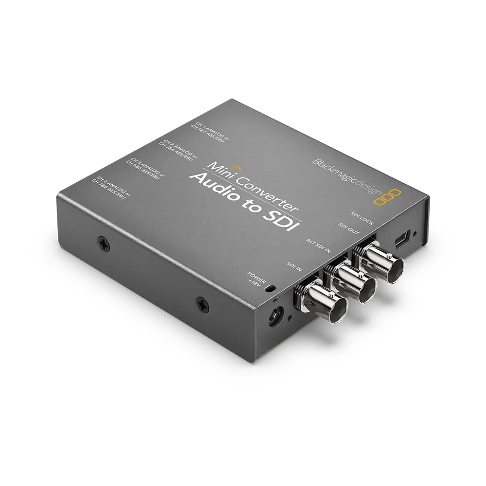 3G/HD/SD-SDI kaynaklarına ses gömme (embed) işlemi yapın; Blackmagic Design’ın Audio to SDI Mini Converter’ı ile 1080p60 çözünürlüğe kadar desteklenir. Dört adet dengeli analog kanal veya sekiz adet AES/EBU kanalını dört 1/4″ jak üzerinden bağlayabilirsiniz.