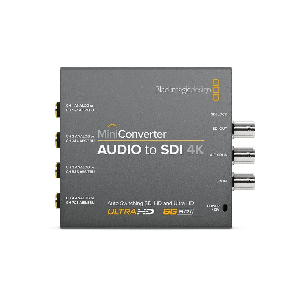 Blackmagic Design Mini Converter Audio to SDI 4K, dört kanallı analog ses veya sekiz kanallı AES/EBU dijital sesi herhangi bir SDI video sinyaline gömme imkânı sağlar. Cihaz, Ultra HD (3840×2160) ve DCI 4K (4096×2160) çözünürlüklerini destekleyen bir 6G-SDI girişi ile donatılmıştır. Analog veya dijital ses kanallarınızı bağlamak ve gömmek için dört adet 1/4” ses jakı bulunmaktadır. Ses gömülü SDI sinyali, orijinal giriş kaynağı ile aynı çözünürlük ve kare hızıyla tek bir 6G-SDI çıkış üzerinden iletilir.