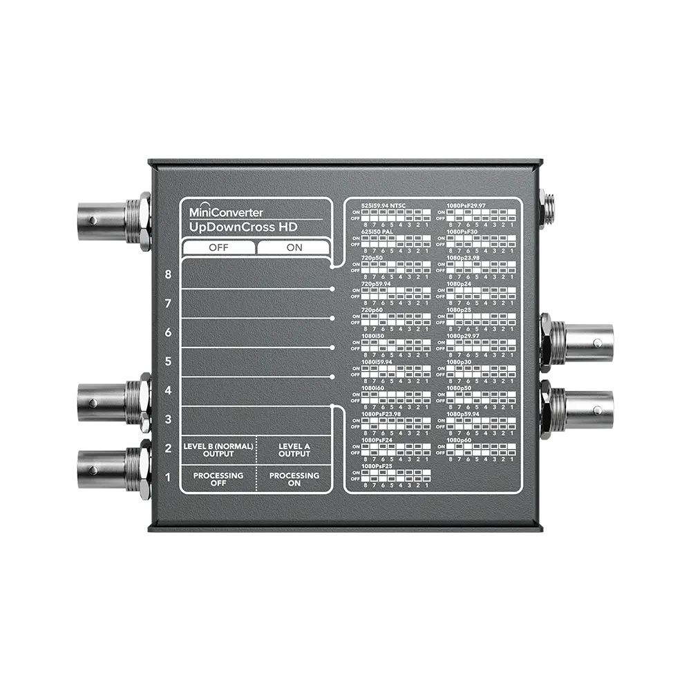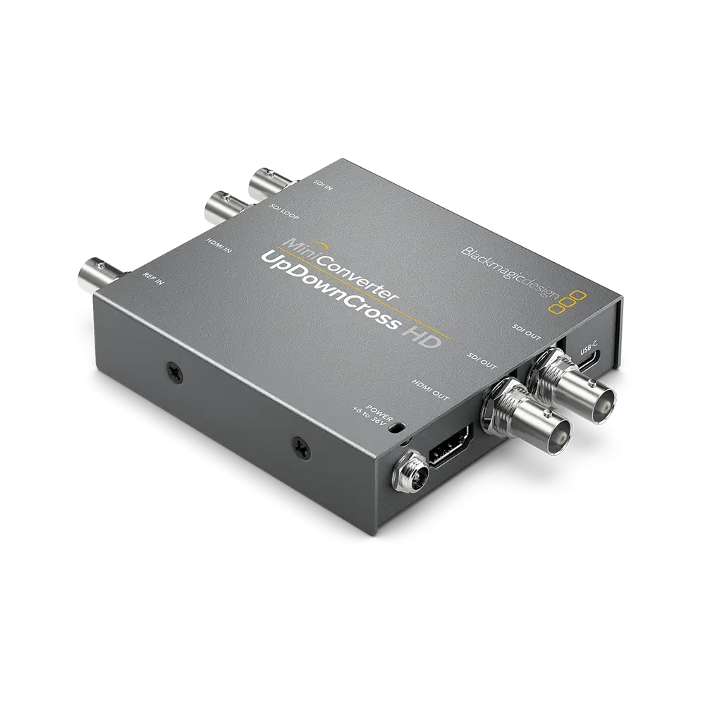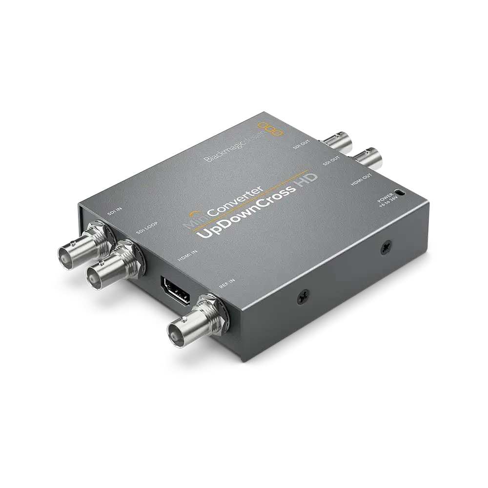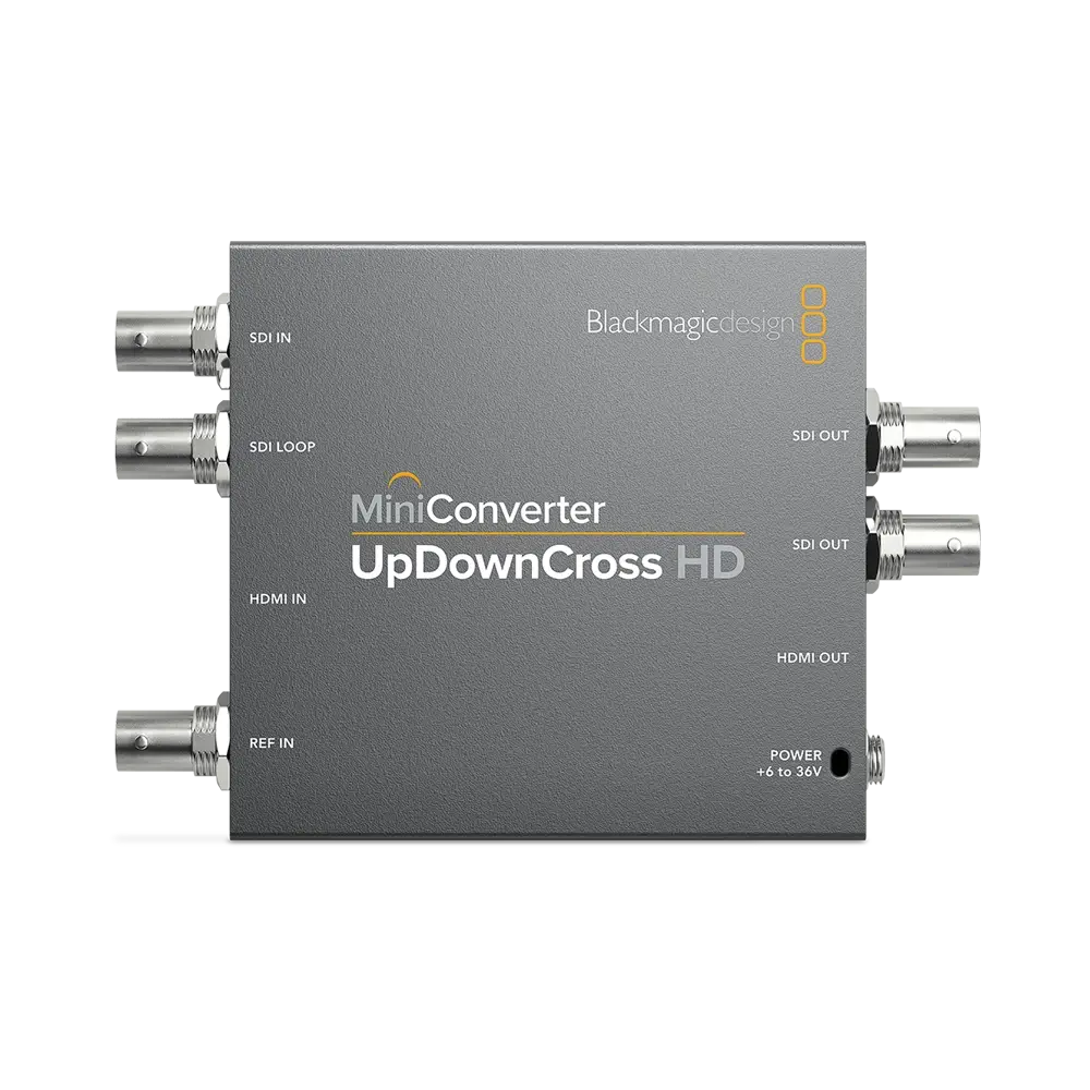 Blackmagic Design Mini Converter UpDownCross HD kullanarak, herhangi bir SD ve HD video formatı arasında otomatik olarak çapraz dönüşüm yapabilirsiniz. Bu dönüştürücü, 1080p60’a kadar sinyalleri destekler ve bir 3G/HD/SD-SDI girişi, iki 3G/HD/SD-SDI çıkışı ve bir döngü çıkışı, bir HDMI girişi ve bir HDMI çıkışı içerir. Çok yönlü bu dönüştürücü, HDMI girişi aracılığıyla bilgisayar DVI çözünürlüklerini ölçeklendirme özelliğine sahiptir; bu sayede HDMI bilgisayarları SDI projektörlere kolayca bağlayabilirsiniz.