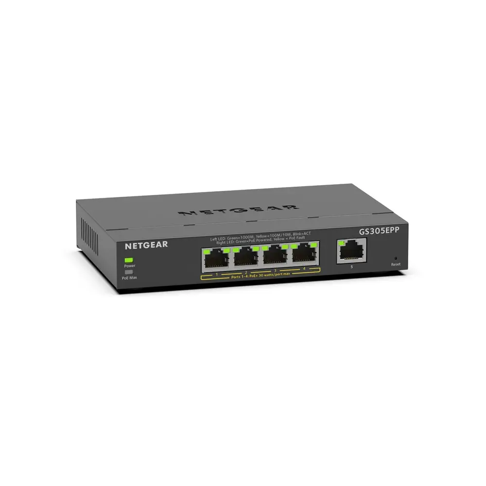 Küçük ev veya iş ağınızı bilgisayarlar, depolama üniteleri, akıllı TV’ler ve daha fazlasını destekleyecek şekilde hızlıca genişletin: Netgear GS305EPP 5-Port Gigabit PoE+ Uyumlu Yönetilebilir Switch ile. Beş adet Gigabit Ethernet portu bulunan bu kompakt yönetilebilir switch’in dördü PoE+ uyumlu olup 120W güç bütçesi sunar. Böylece IP kameralar, VoIP telefonlar ve erişim noktaları gibi PoE destekli cihazlarınızı kolayca besleyebilirsiniz.