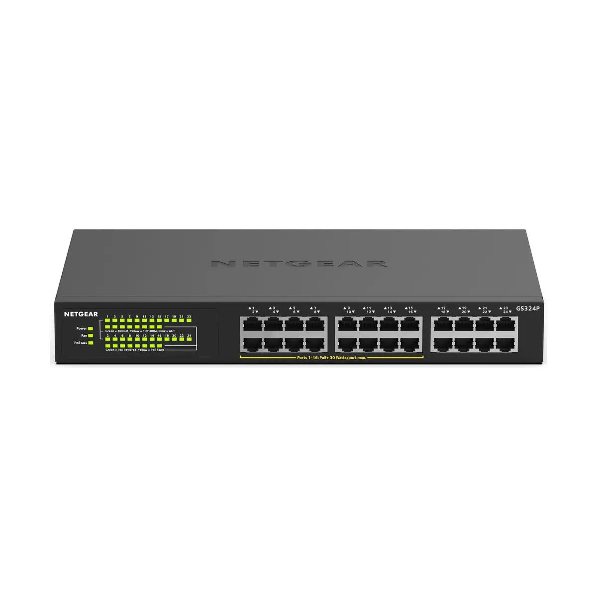 NETGEAR GS324P 24-Port Gigabit PoE+ Yönetilemeyen Switch ile küçük işletmenizin ağ kapasitesini artırın. Toplam 48 Gb/sn anahtarlama bant genişliği ve 1.44 Mpps yönlendirme hızı sunan bu masaüstü ve duvara monte edilebilen yönetilemeyen switch, 24 Gigabit Ethernet portu ile gelir. Bu portların onaltısı PoE+ (Power over Ethernet) desteği sunar ve 190W toplam güç bütçesi ile IP kameralar, VoIP telefonlar, kablosuz erişim noktaları ve diğer PoE uyumlu cihazları beslemek için idealdir.