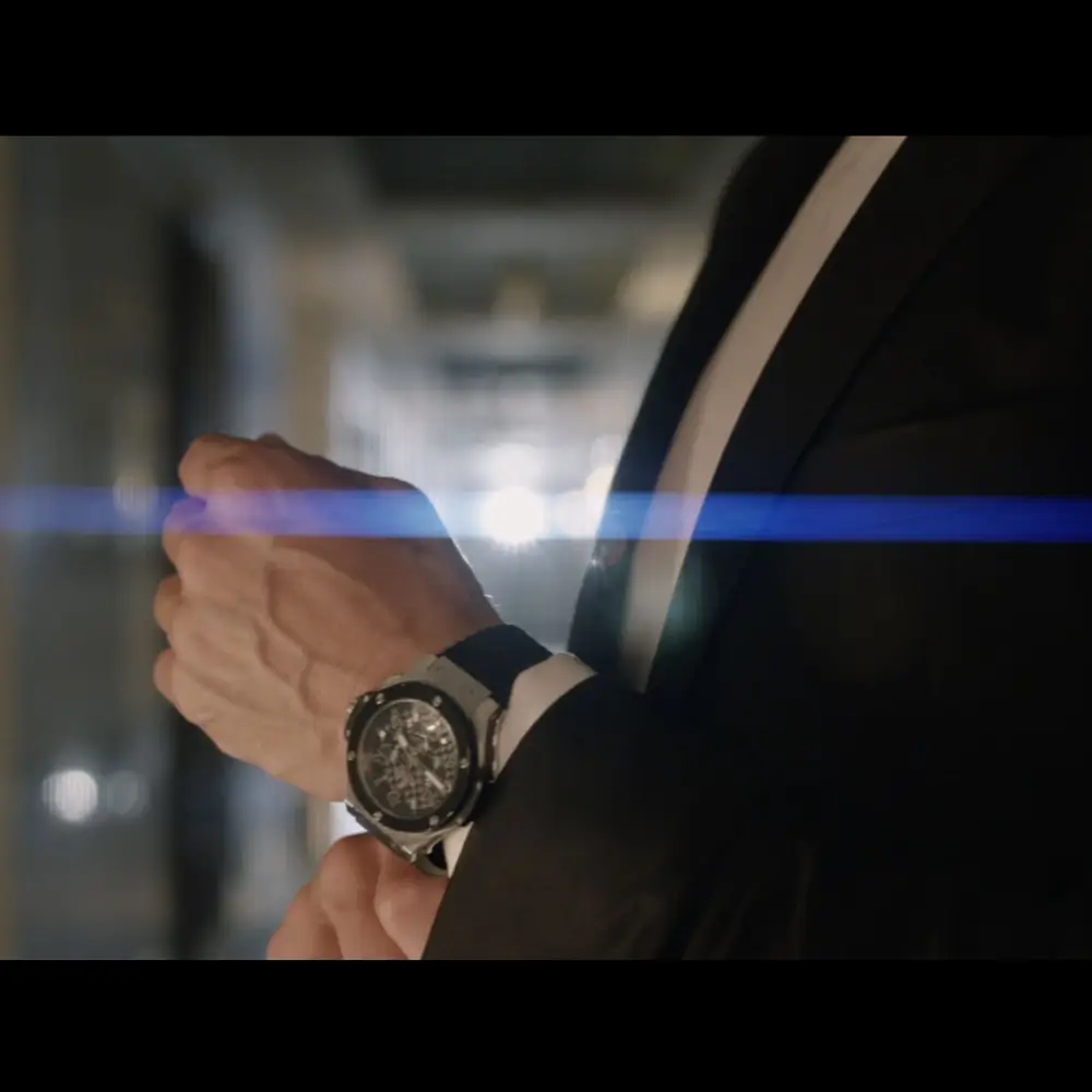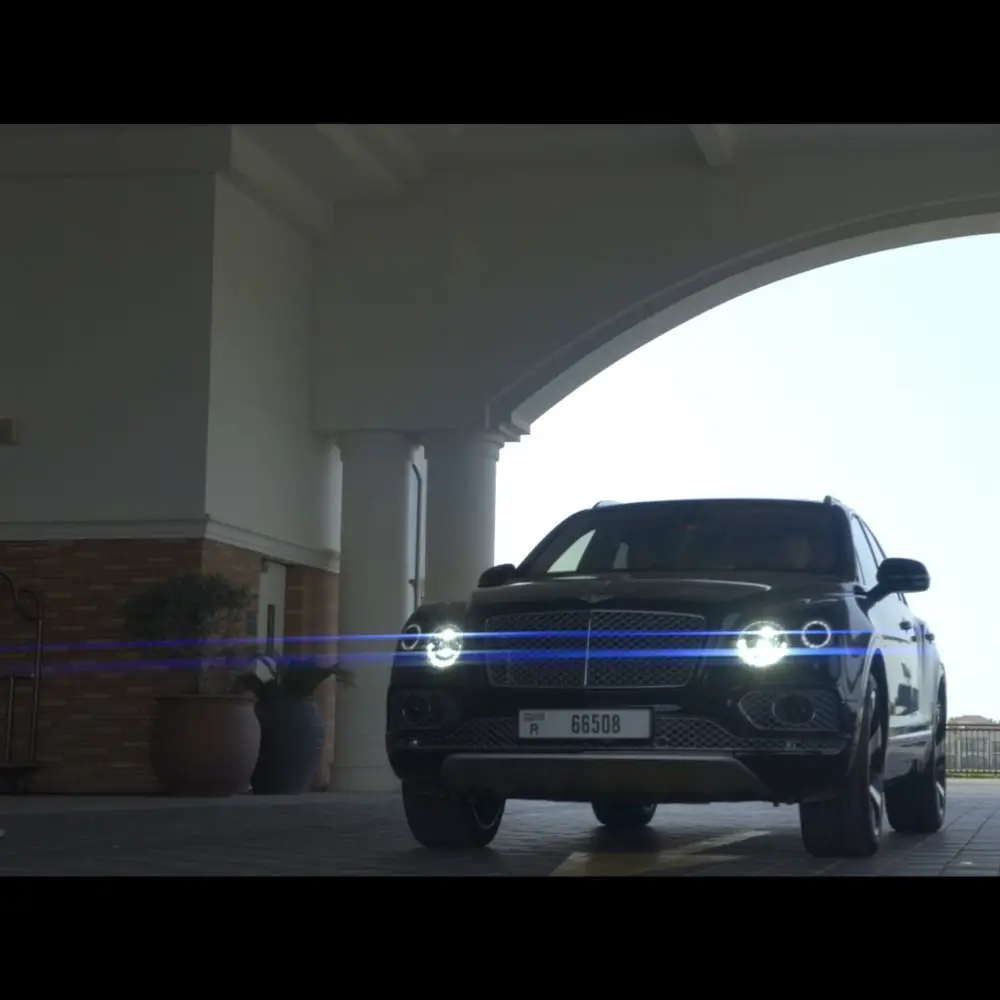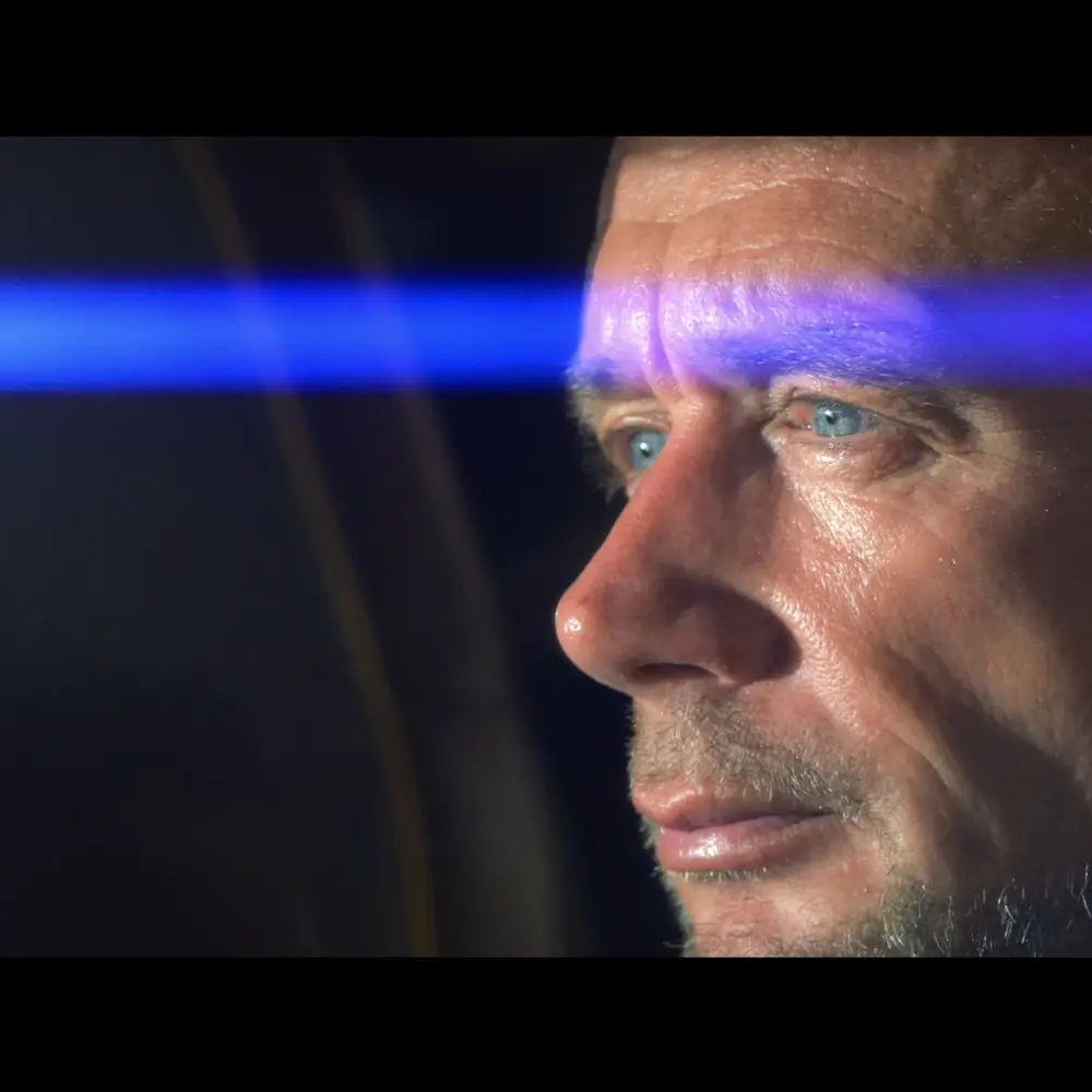 Işık kaynağından yatay olarak uzanan uzun mavi çizgi efektleri oluşturur.