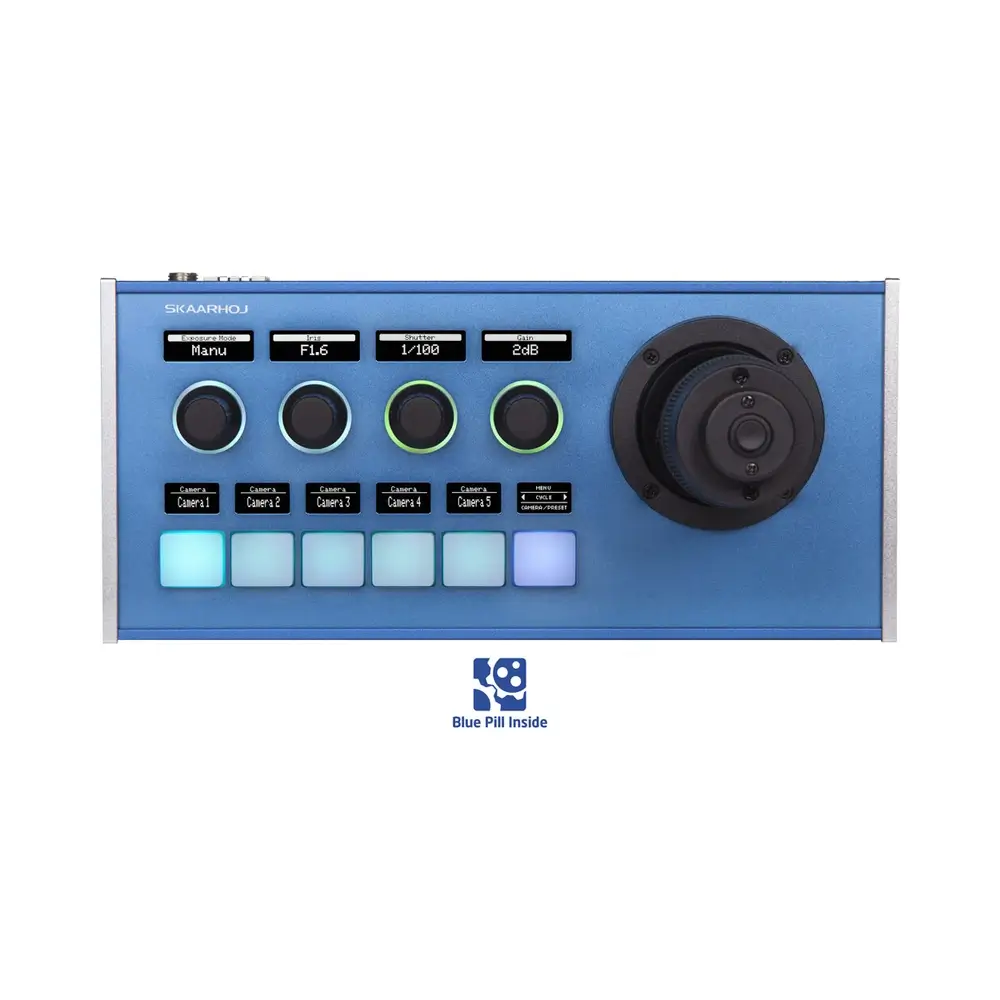 SKAARHOJ PTZ Fly with Blue Pill Inside, PTZ kameralarınızı parmak uçlarınızla hassas bir şekilde kontrol etmenizi sağlayan kompakt bir kontrol ünitesidir. Tam boy üç eksenli joystick ile kameralarınızı kolayca pan, tilt ve rotate edebilirsiniz. Ünite ayrıca, geniş ekranlı OLED ekranlara sahip dört arka aydınlatmalı encoder düğmesi ve ön ayarlar ile kamera seçimi için altı programlanabilir dört yönlü çok fonksiyonlu tuş içerir.