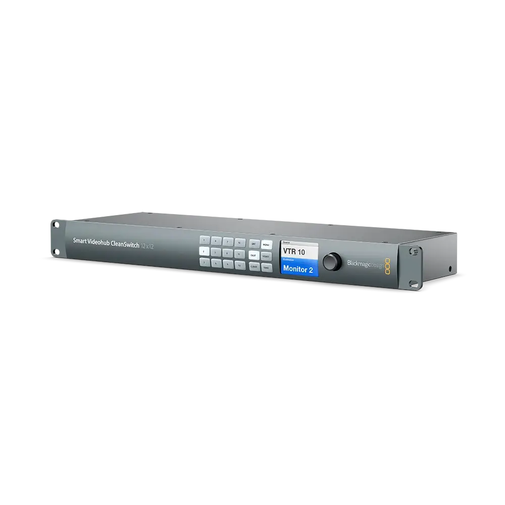 Blackmagic Design’ın Smart Videohub CleanSwitch 12 x 12 6G-SDI modeli, SD, HD, Ultra HD 4K ve DCI 4K video kombinasyonlarını yönlendirebilen karma formatlı bir yönlendirici (router) sistemidir. CleanSwitch modeli, SDI sinyallerinin yeniden zamanlamasına (re-timing) olanak tanır, böylece tüm geçişler kareler arasında gerçekleşir. 4:2:2 ve 4:4:4 renk örneklemesini ve daha düzgün ton geçişleri için 10-bit işlemeyi destekler. 1RU boyutunda bir kasaya sahip olan Smart Videohub, hem büyük yayın sistemlerinde hem de canlı prodüksiyonlar için taşınabilir mini racklerde kullanım için idealdir. Dahili bir LCD ekran, kaynaklarınızı doğrudan yönlendirici üzerinde görüntülemenizi sağlar; kontrol için basit push butonlar ve döner düğme mevcuttur. Yönlendirme ayrıca özel uzaktan kumanda panelleri veya Mac OS X ve Windows için sağlanan yazılım üzerinden Ethernet ile de kontrol edilebilir. Mevcut iPad uygulamasıyla kablosuz ağ üzerinden yönlendirme değişiklikleri yapmak da mümkündür.