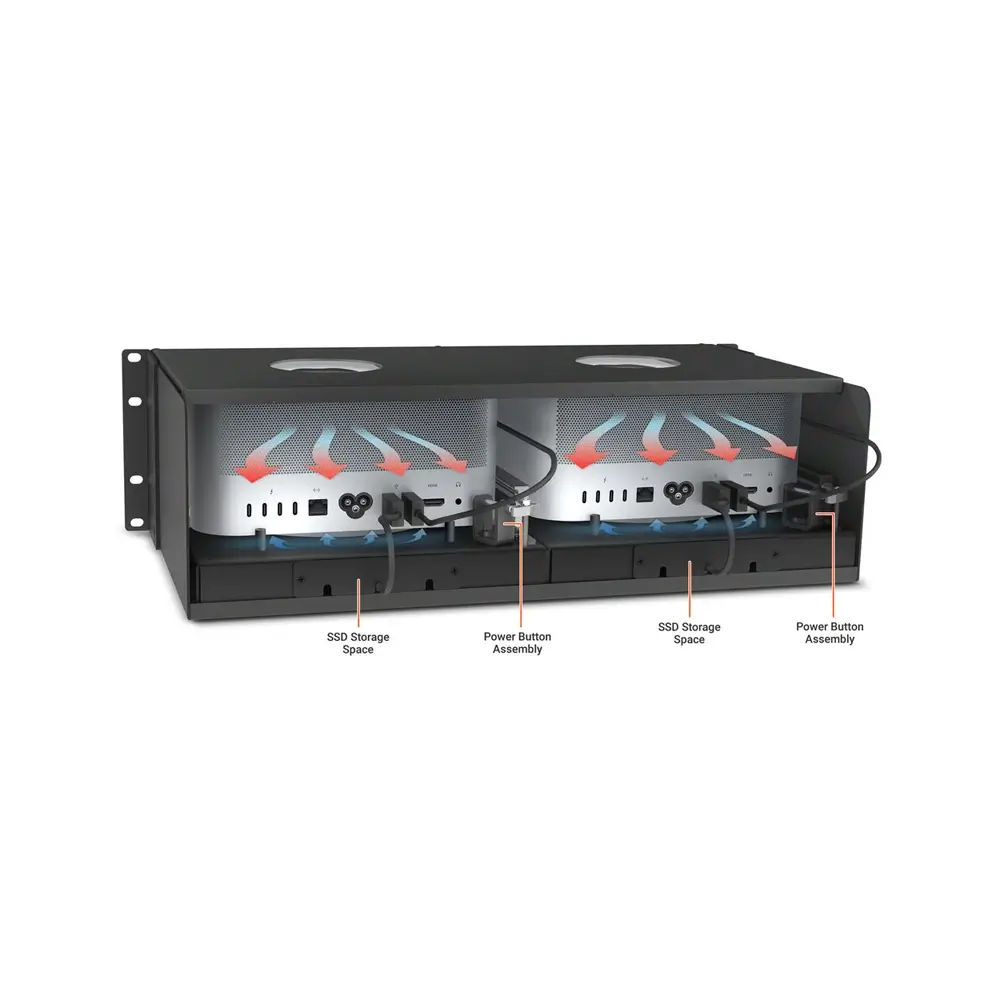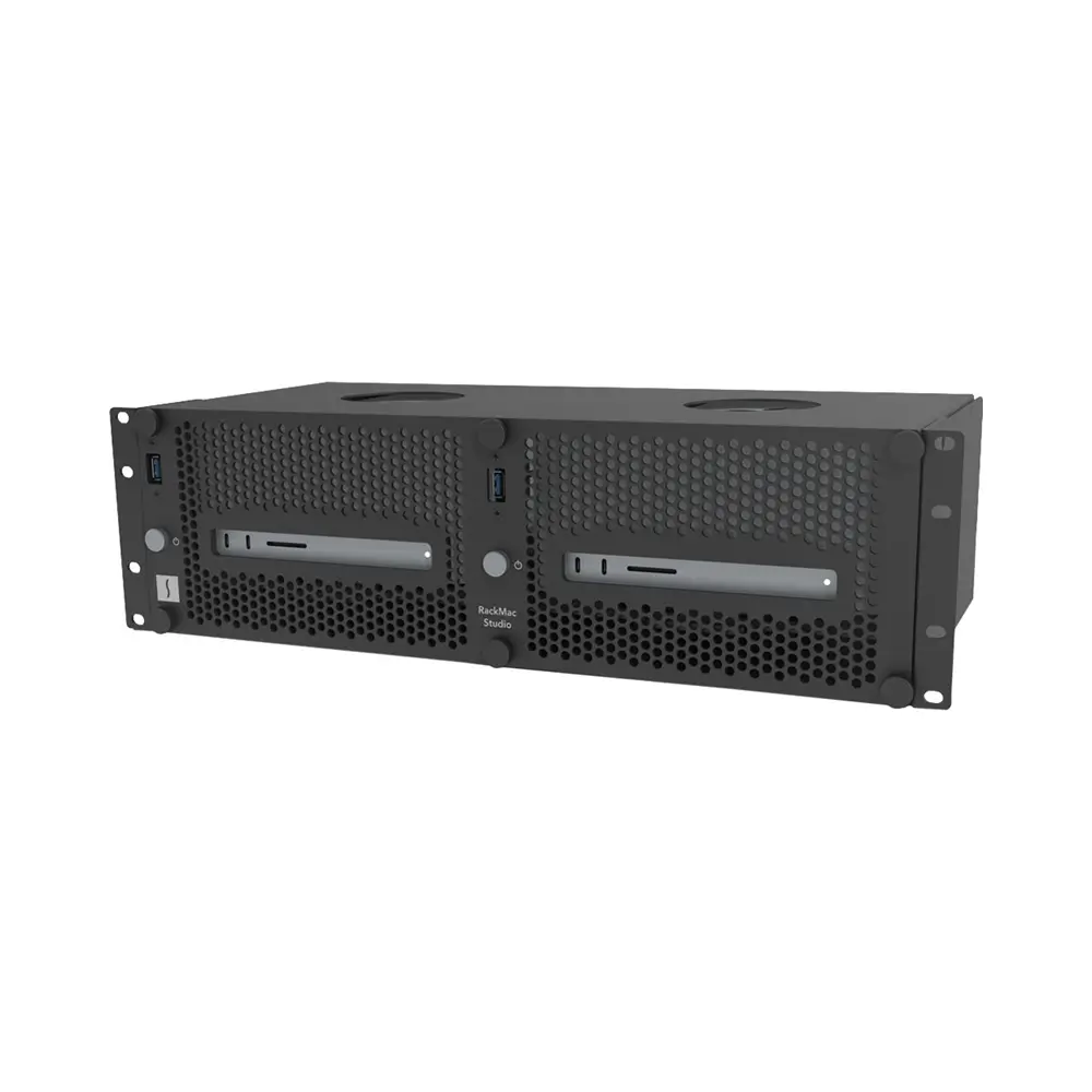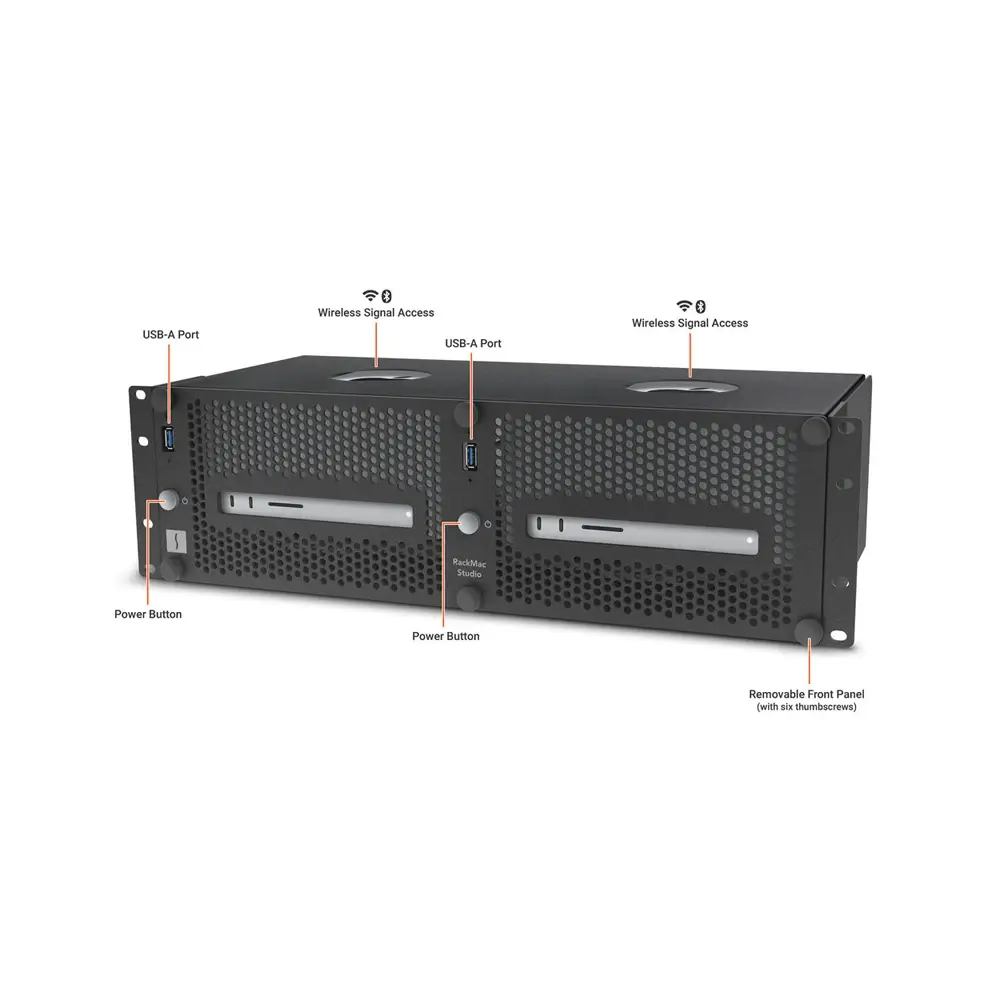 RackMac Studio, bir veya iki Mac Studio bilgisayarını rack içine güvenle sabitlemek için dayanıklı çelik 3U rackmount kabin sunar. Ön panel kolayca çıkarılabilir ve bilgisayarların kendi ön güç düğmeleriyle açılmasına, USB cihazlarının pas-through USB-A portları üzerinden bağlanmasına ve bilgisayarların ön portları ile SD kart yuvalarına erişime olanak tanır. Tasarım, kabloları bilgisayarları çıkarma gereği olmadan bağlayıp çıkarmanızı sağlar.