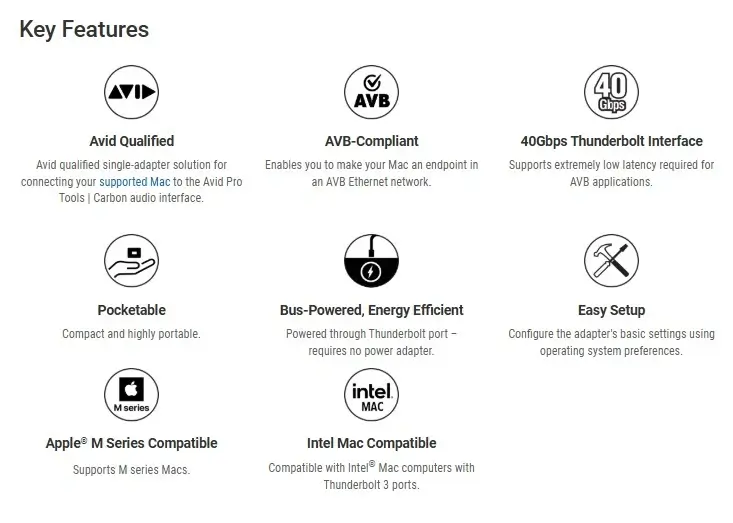 Eğer bilgisayarınızda yerleşik Ethernet yoksa, AVB uyumlu Thunderbolt™ Gigabit Ethernet adaptörüne ihtiyacınız vardır. Avid tarafından onaylı Sonnet Thunderbolt AVB adaptörü, Thunderbolt portlu Mac’inizi Carbon arayüzüne bağlamak için ideal tek adaptör çözümüdür.