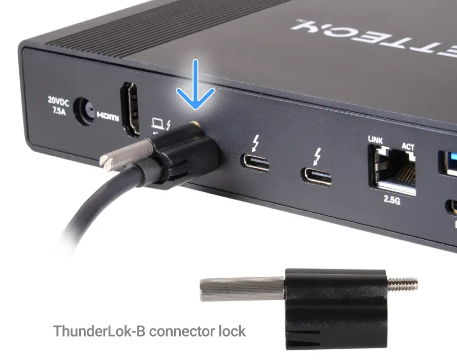 ThunderLok-B konnektör kilidi, Solo10G Thunderbolt Adaptörü veya Echo 20 Thunderbolt 4 SuperDock ile gelen Thunderbolt 4 kablolarını güvenli bir şekilde kilitleyerek stabil ve kesintisiz bağlantı sağlar.