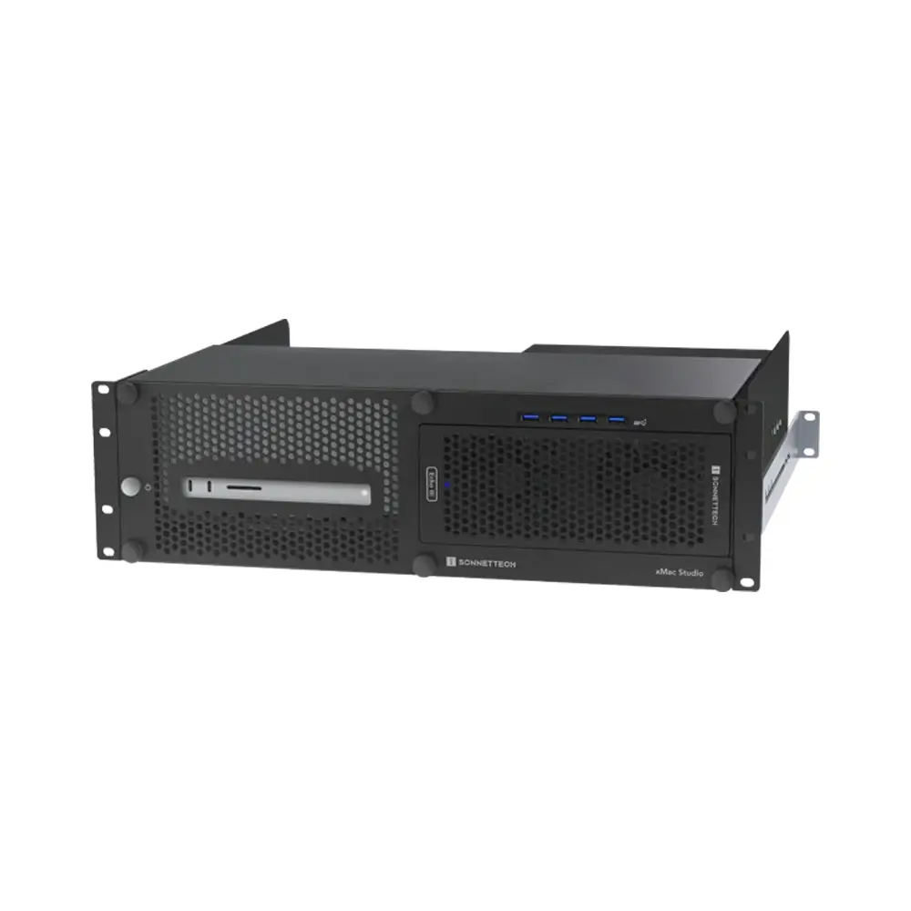 xMac Studio, sağlam çelikten yapılmış bir 3U rackmount kasadır. Mac Studio’yu güvenli bir şekilde monte eder, ön paneli hızlıca çıkarılabilir hale getirir ve isteğe bağlı PCIe kart genişletme modülü ile uyumludur.