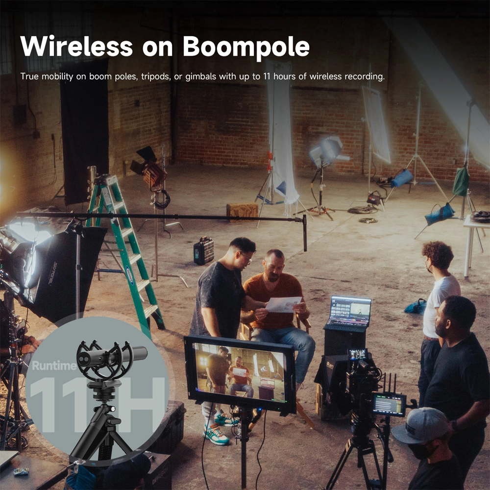 - Boom Pole Üzerinde Kablosuz Kullanım Dahili bataryası ve 2,4 GHz iletimi sayesinde D2 Wireless, boom pole’lar, tripodlar veya gimbal üzerinde tam hareket özgürlüğü ile 11 saate kadar kayıt imkânı sunar.