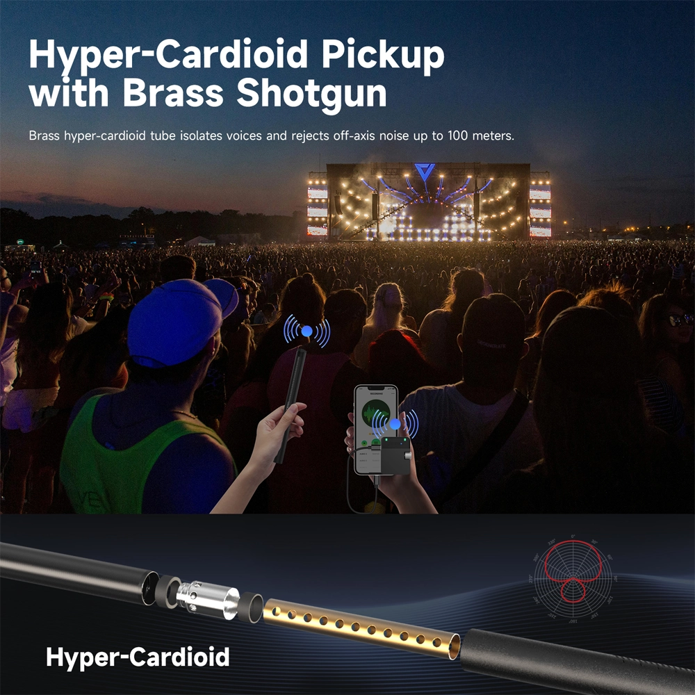 - Pirinç Shotgun ile Hiper Kardioid Alım Pirinçten yapılmış shotgun, ses kaynağından 100 metreye kadar hiper kardioid alım sağlar ve 94+dB ile inanılmaz bir SNR sunar.