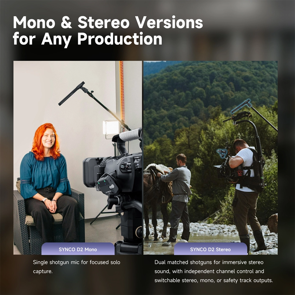 - Her Üretim İçin Mono & Stereo Versiyonlar Mono versiyon, tek bir shotgun mikrofon ve alıcı içerir; solo ses kaydı, vlog veya elde taşınan boom kurulumları için idealdir. Stereo versiyon ise iki shotgun ile etkileyici stereo ses sağlar; konserler, ortam kayıtları veya sinematik B-roll için mükemmeldir.