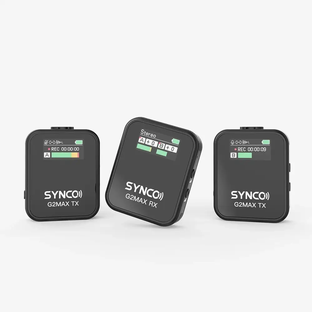 SYNCO G2 Max, video çekimleri için tasarlanmış kablosuz mikrofonlardır ve 1-alıcı-1-verici ile 1-alıcı-2-verici seçenekleri mevcuttur. 8GB dahili hafızası sayesinde ses kayıtları için yedekleme sağlar ve içerik üreticilerin dış mekan vlogları veya YouTube videolarını özgürce kaydetmesine olanak tanır. Syncoder™ Algoritması 4.0, 656 ft (LOS) mesafeye kadar kesintisiz iletim sağlar. Gelişmiş Gürültü Engelleme Algoritması 3 seviyeli gürültü azaltma sunar ve tek tıklamayla yüksek kaliteli ses kaydı yapılmasını kolaylaştırır. 6 seviyeli kazanç kontrolü, 8 saatlik çalışma süresi ve gerçek zamanlı izleme ile G2 Max; akıllı telefonlar, bilgisayarlar, kameralar, hoparlörler ve daha fazlası ile uyumlu çalışır.