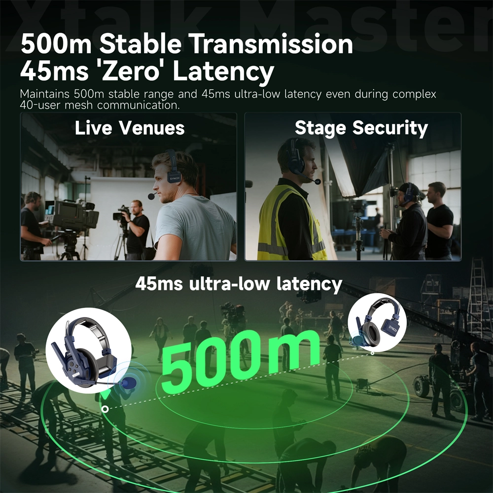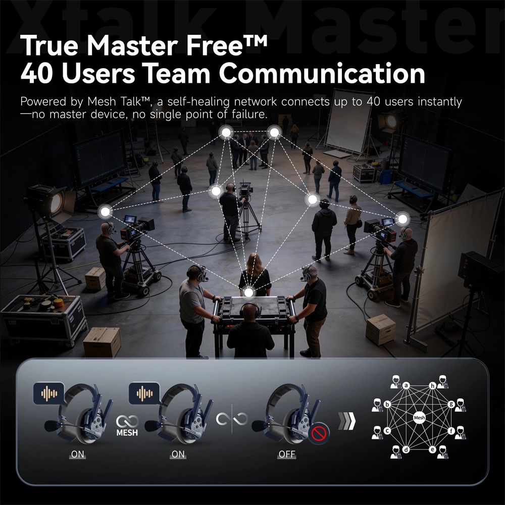 MasterFree 3.0 Teknolojisi: Ana Ünite Karmaşasına Son Mesh Talk™ MasterFree 3.0 ile güçlendirilen Xtalk Master, merkezi bir “ana ünite” ihtiyacını tamamen ortadan kaldırır. Her kulaklık eşit ve bağımsız bir düğüm olarak çalışır. Gücü açtığınız anda sistem kendi ağını kurar. Bir ekip üyesi uzaklaşsa veya hattan düşse bile sistem, manuel müdahale gerektirmeden bağlantıyı otomatik olarak onarır.
