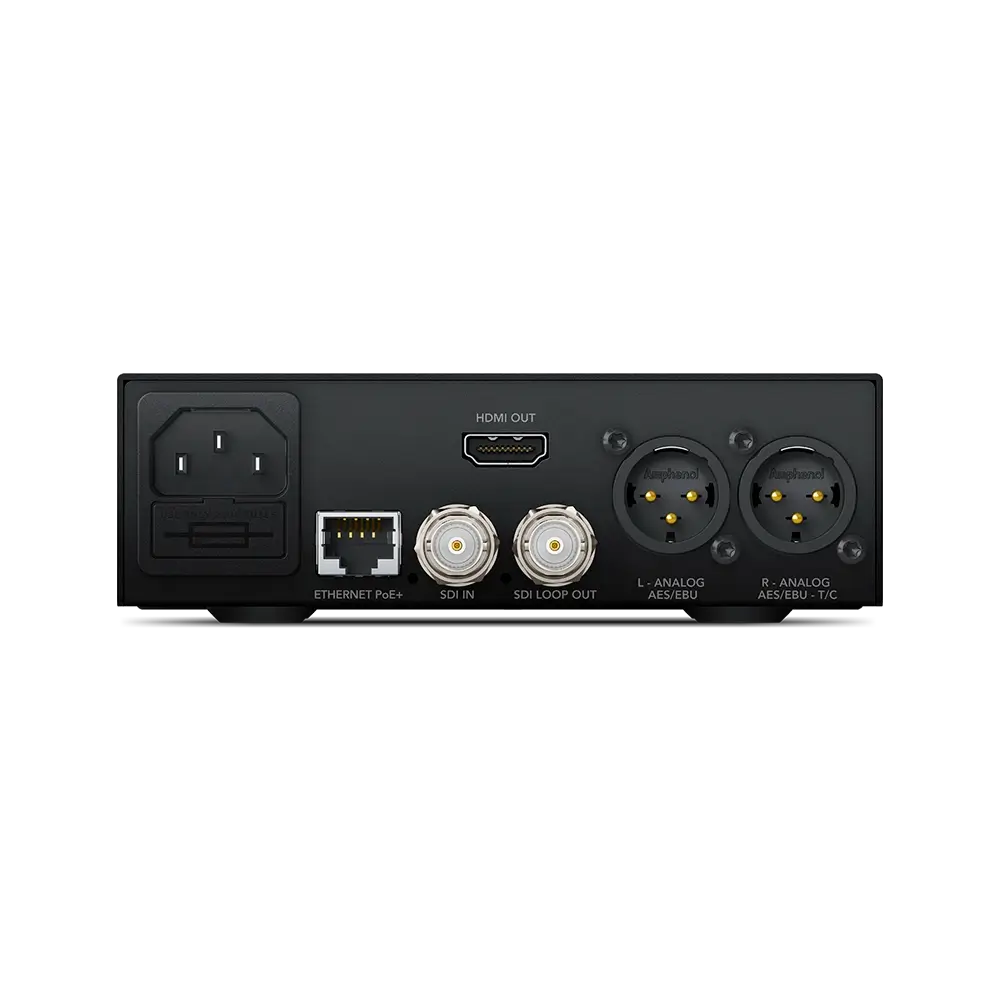 Kompakt tasarımı sayesinde Teranex Mini, canlı etkinliklerde taşınabilir rackler veya yayın araçlarında kullanım için idealdir. İsteğe bağlı 1U 19″ rack tepsisine üç ünite kolayca monte edilebilir ve çıkarılabilir, tüm bunlar 12G-SDI desteği ile sağlanır. Arkadaki Ethernet portu, cihazı uzaktan yönetmeye veya alternatif olarak Power-over-Ethernet (PoE) ile çalıştırmaya olanak tanır. PoE kullanmak istemiyorsanız, entegre 90-240V güç kaynağı sayesinde sadece standart bir IEC güç kablosu yeterlidir (ayrı satılır).